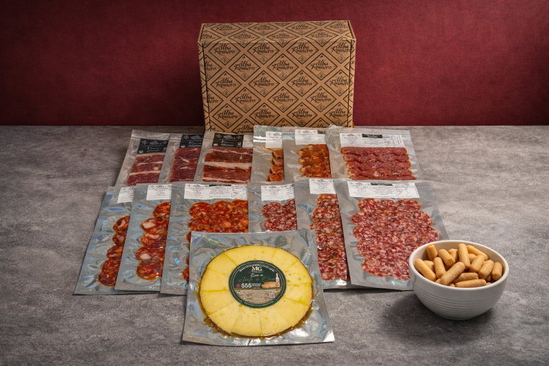 La clave de este pack está en su equilibrio. No es solo “poner embutido”; es montar una tabla con ritmo, variedad y presencia. El jamón de bellota 100% ibérico abre la degustación con un bocado elegante y protagonista. La caña de lomo con pimentón aporta un matiz distinto, más aromático. Chorizo y salchichón completan el recorrido con intensidad y suavidad, para que cada persona vaya alternando según apetito. Y el queso viejo de mezcla en aceite de oliva virgen extra pone el broche final: cremosidad, carácter y ese contraste que hace que la mesa se sienta más completa.
